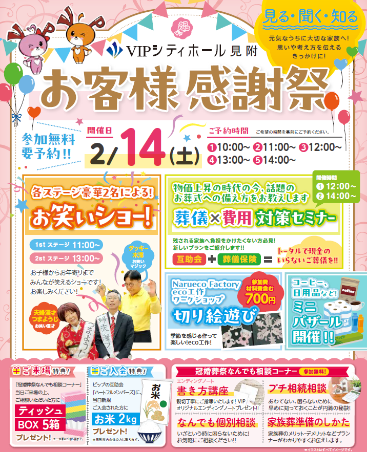 終活・葬儀 開催日2026年2月14日(土) 【長岡202602】見附 お客様感謝祭 × お客様感謝祭♪ たのしいイベント盛りだくさん! 大変賑わうイベントです。 ぜひご予約の上、お越しくださいませ。 下記フォームまたはお電話にてご予約ください。 (確認のためお電話させて頂く場合があります。) TEL 0258-36-3000 開催日時2026年2月14日(土)10時~16時 開催場所VIPシティホール見附|新潟県見附市市野坪町1209 メールアドレス 必須 お名前 必須 ふりがな 必須 ご住所必須 郵便番号 都道府県 都道府県 北海道 青森県 岩手県 宮城県 秋田県 山形県 福島県 茨城県 栃木県 群馬県 埼玉県 千葉県 東京都 神奈川県 新潟県 富山県 石川県 福井県 山梨県 長野県 岐阜県 静岡県 愛知県 三重県 滋賀県 京都府 大阪府 兵庫県 奈良県 和歌山県 鳥取県 島根県 岡山県 広島県 山口県 徳島県 香川県 愛媛県 高知県 福岡県 佐賀県 長崎県 熊本県 大分県 宮崎県 鹿児島県 沖縄県 市区町村、番地 建物名 お電話番号 必須 性別 必須 男性 女性 年齢 必須 歳 担当者 任意 ご予約時間必須 10:00~ 11:00~ 12:00~ 13:00~ 14:00~ お笑いショー参加 1部(11:00)に参加する 2部(13:00)に参加する 参加しない 切り絵遊び 参加する 参加しない