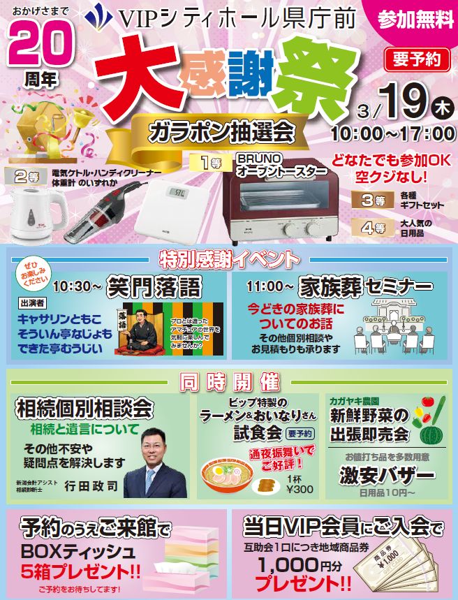 終活・葬儀 開催日2026年3月19日 【新潟202603】県庁前ホール大感謝祭 × 20周年大感謝祭 豪華景品のガラポン抽選会! ぜひ、VIPシティホール県庁前にお越しください 下記のフォームまたは、お電話からご予約ください。 TEL 025‐285‐1110 開催日時2026年3月19日10:00~17:00 開催場所VIPシティホール県庁前|新潟県新潟市中央区鳥屋野 メールアドレス 必須 お名前 必須 ふりがな 必須 ご住所必須 郵便番号 都道府県 都道府県 北海道 青森県 岩手県 宮城県 秋田県 山形県 福島県 茨城県 栃木県 群馬県 埼玉県 千葉県 東京都 神奈川県 新潟県 富山県 石川県 福井県 山梨県 長野県 岐阜県 静岡県 愛知県 三重県 滋賀県 京都府 大阪府 兵庫県 奈良県 和歌山県 鳥取県 島根県 岡山県 広島県 山口県 徳島県 香川県 愛媛県 高知県 福岡県 佐賀県 長崎県 熊本県 大分県 宮崎県 鹿児島県 沖縄県 市区町村、番地 建物名 お電話番号 必須 性別 必須 男性 女性 年齢 必須 歳 担当者 任意 ラーメン試食会(¥300)必須 0名(希望しない) 1名 2名 3名 4名