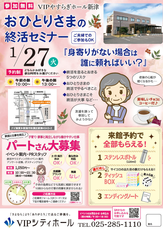 終活・葬儀 開催日 【新潟202601】やすらぎ新津 終活相談会 × 終活相談会を開催致します。 ご予約は下記フォーム、またはお電話にて TEL 025‐285‐1110 (ご予約の確認のために、弊社より電話をさせて頂く場合があります。) 開催日時10時~15時 開催場所VIPやすらぎホール新津|新潟県新潟市秋葉区新津4543−2 メールアドレス 必須 お名前 必須 ふりがな 必須 ご住所必須 郵便番号 都道府県 都道府県 北海道 青森県 岩手県 宮城県 秋田県 山形県 福島県 茨城県 栃木県 群馬県 埼玉県 千葉県 東京都 神奈川県 新潟県 富山県 石川県 福井県 山梨県 長野県 岐阜県 静岡県 愛知県 三重県 滋賀県 京都府 大阪府 兵庫県 奈良県 和歌山県 鳥取県 島根県 岡山県 広島県 山口県 徳島県 香川県 愛媛県 高知県 福岡県 佐賀県 長崎県 熊本県 大分県 宮崎県 鹿児島県 沖縄県 市区町村、番地 建物名 お電話番号 必須 性別 必須 男性 女性 年齢 必須 歳 担当者 任意 ご来館時間 午前の部 10:00~ 午後の部 13:00~