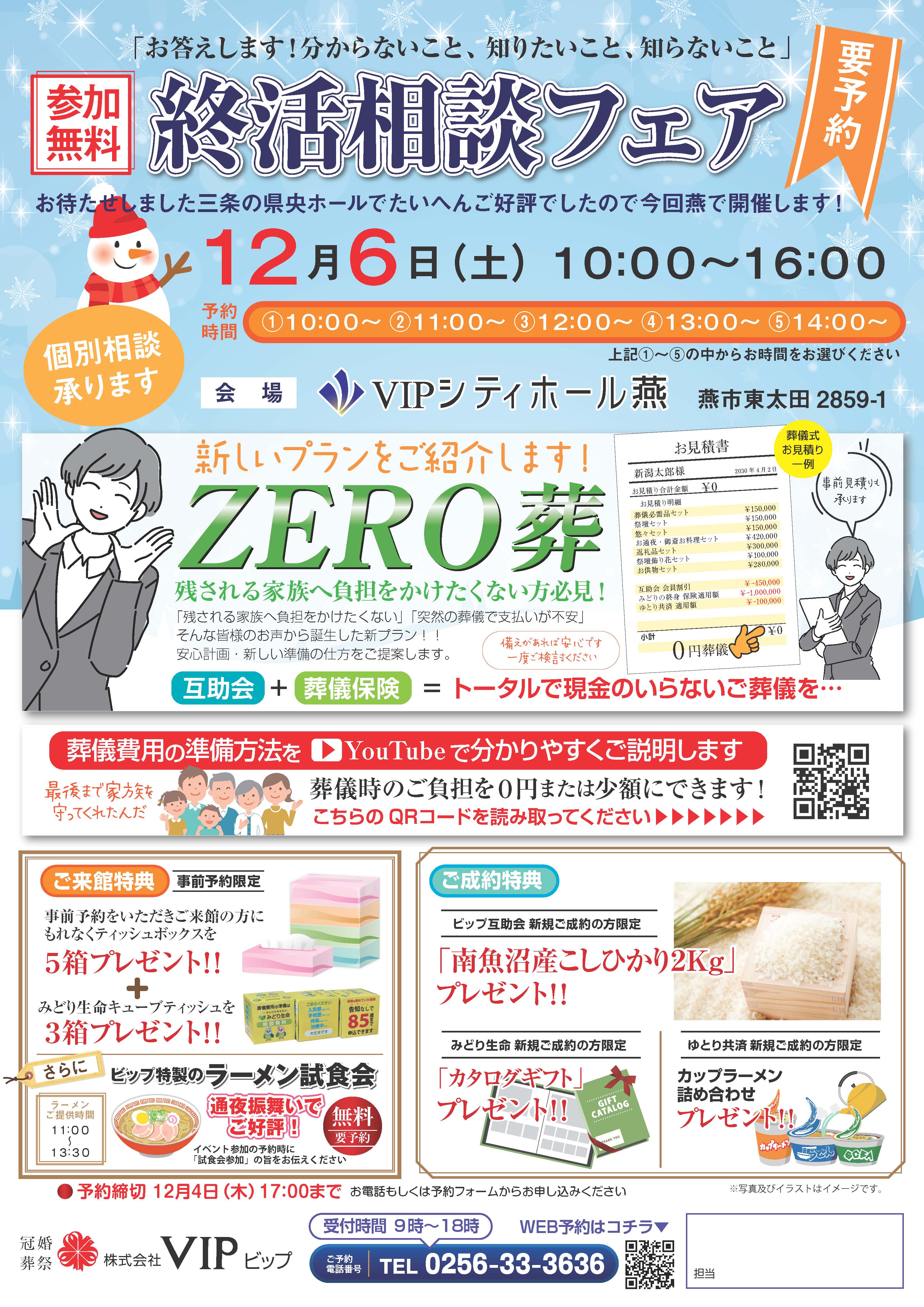 終活・葬儀 開催日2025年12月6日 【県央202512】12/6 燕終活相談フェア × お待たせしました三条の県央ホールでたいへんご好評でしたので今回燕で開催します! ご予約はお電話 TEL 0256-33-3636 または 下記フォームへ 開催日時2025年12月6日10:00~16:00 開催場所VIPシティホール燕|燕市東太田2859−1 メールアドレス 必須 お名前 必須 ふりがな 必須 ご住所必須 郵便番号 都道府県 都道府県 北海道 青森県 岩手県 宮城県 秋田県 山形県 福島県 茨城県 栃木県 群馬県 埼玉県 千葉県 東京都 神奈川県 新潟県 富山県 石川県 福井県 山梨県 長野県 岐阜県 静岡県 愛知県 三重県 滋賀県 京都府 大阪府 兵庫県 奈良県 和歌山県 鳥取県 島根県 岡山県 広島県 山口県 徳島県 香川県 愛媛県 高知県 福岡県 佐賀県 長崎県 熊本県 大分県 宮崎県 鹿児島県 沖縄県 市区町村、番地 建物名 お電話番号 必須 性別 必須 男性 女性 年齢 必須 歳 担当者 任意 ご来館時間必須 10:00 11:00 12:00 13:00 14:00 試食会参加必須 希望する 希望しない