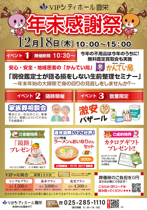 終活・葬儀 開催日2025年12月18日 【新潟202512】年末感謝祭 豊栄 12/18 × VIPシティホール豊栄で年末感謝祭を開催します! 新年に必要な鏡餅をプレゼント!! ぜひお気軽にご参加ください!! ご予約は下記フォーム、またはお電話にて TEL 025 - 285 - 1110 開催日時2025年12月18日10時~15時 開催場所VIPシティホール豊栄|新潟県新潟市北区葛塚447 メールアドレス 必須 お名前 必須 ふりがな 必須 ご住所必須 郵便番号 都道府県 都道府県 北海道 青森県 岩手県 宮城県 秋田県 山形県 福島県 茨城県 栃木県 群馬県 埼玉県 千葉県 東京都 神奈川県 新潟県 富山県 石川県 福井県 山梨県 長野県 岐阜県 静岡県 愛知県 三重県 滋賀県 京都府 大阪府 兵庫県 奈良県 和歌山県 鳥取県 島根県 岡山県 広島県 山口県 徳島県 香川県 愛媛県 高知県 福岡県 佐賀県 長崎県 熊本県 大分県 宮崎県 鹿児島県 沖縄県 市区町村、番地 建物名 お電話番号 必須 性別 必須 男性 女性 年齢 必須 歳 担当者 任意 ご参加のイベント必須 10:30~生前整理セミナー 家族葬相談会 激安バザール お食事(人数記入)必須 0名(希望しない) 1名 2名 3名 4名 5名 6名