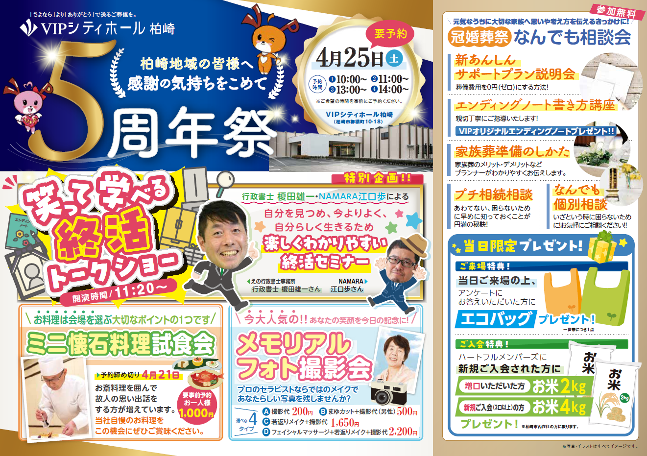 柏崎の皆さまに支えられて5周年!VIPシティホール柏崎では、日頃の感謝を込めて、笑いあり、学びあり、そして美味しいものありの盛りだくさんな「5周年祭」を開催いたします 。