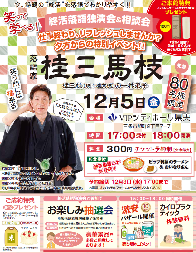 終活・葬儀 開催日2025年12月5日 【県央202512】12/5 県央 終活落語独演会 × 今話題の終活を落語でわかりやすく! 受付 17:00~ 開演 18:00 落語終了後は、通夜振舞で好評のラーメン&お稲荷さんを 特別価格で! お申し込みは、下記フォームまたはお電話にて TEL 0256-33-3636 開催日時2025年12月5日17:00受付スタート 開催場所VIPシティホール県央|三条市旭町2丁目7−7 メールアドレス 必須 お名前 必須 ふりがな 必須 ご住所必須 郵便番号 都道府県 都道府県 北海道 青森県 岩手県 宮城県 秋田県 山形県 福島県 茨城県 栃木県 群馬県 埼玉県 千葉県 東京都 神奈川県 新潟県 富山県 石川県 福井県 山梨県 長野県 岐阜県 静岡県 愛知県 三重県 滋賀県 京都府 大阪府 兵庫県 奈良県 和歌山県 鳥取県 島根県 岡山県 広島県 山口県 徳島県 香川県 愛媛県 高知県 福岡県 佐賀県 長崎県 熊本県 大分県 宮崎県 鹿児島県 沖縄県 市区町村、番地 建物名 お電話番号 必須 性別 必須 男性 女性 年齢 必須 歳 担当者 任意 ご参加人数 お食事 希望する 希望しない ご参加のイベント ガラポン抽選会 メモリアルフォト 激安バザール カイロプラクティック